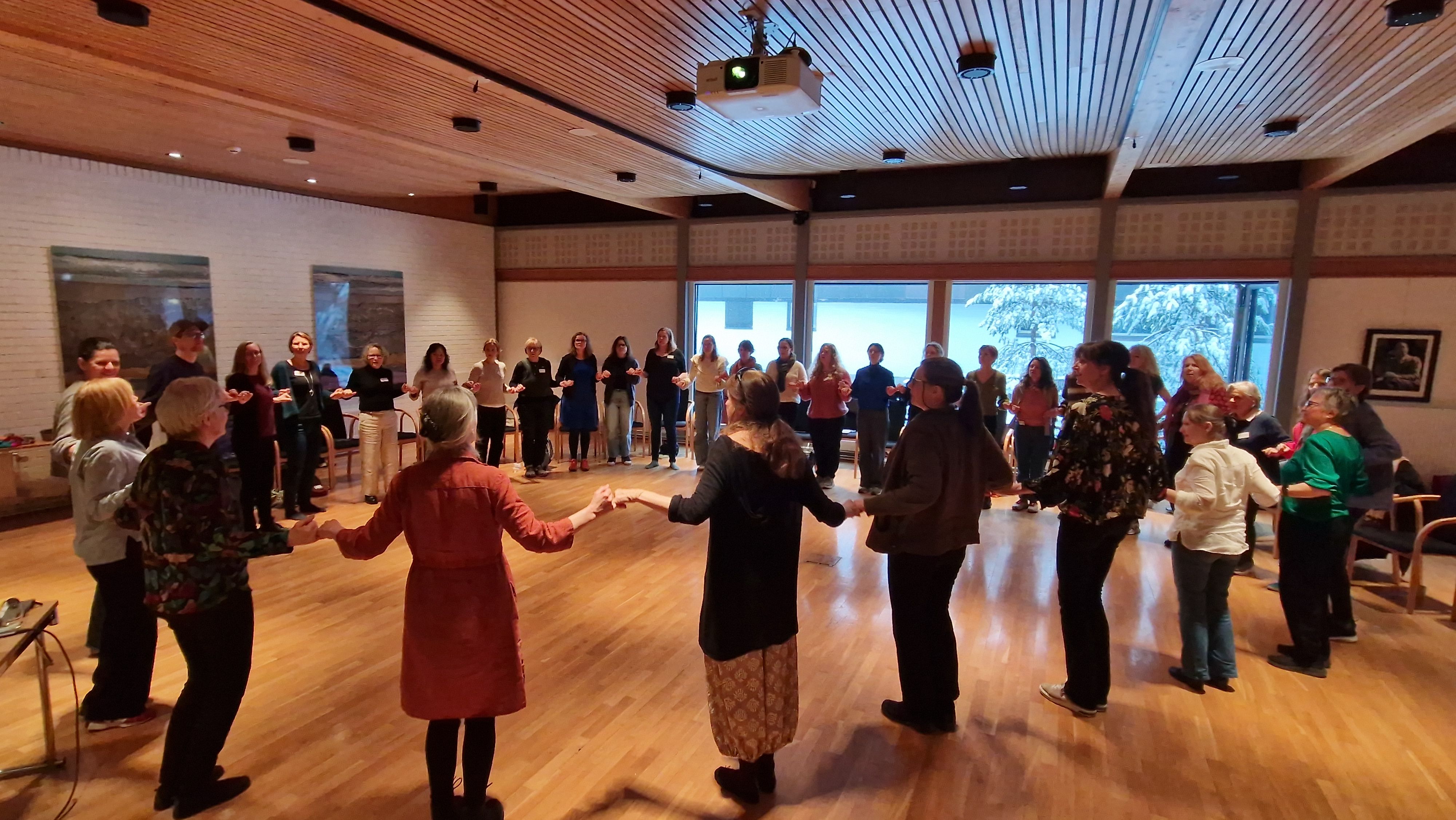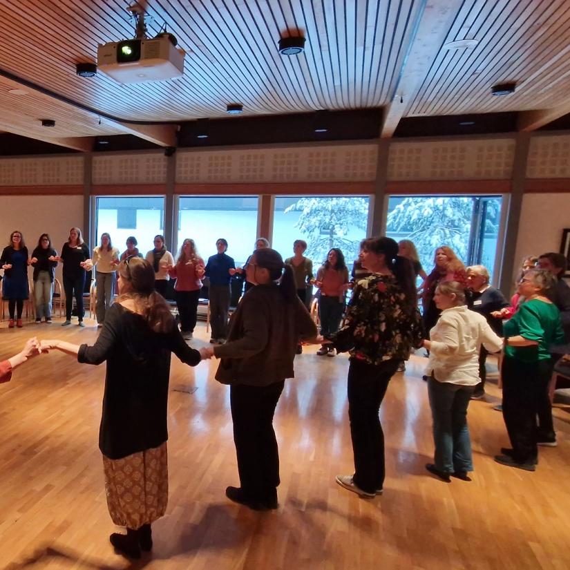 Søndag våknet vi opp til vinterstemning etter at snøen hadde lavet ned hele natten! Etter frokost hadde vi kurs om inkluderende musikkpraksis med Ingrid Danbolt, der vi både joiket, danset, sang og hadde gruppearbeid.